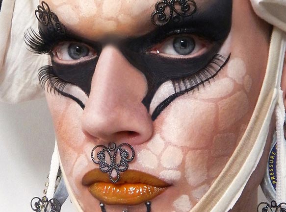 Platform shoes and coloured eyeshadow as eyebrow fill in.
